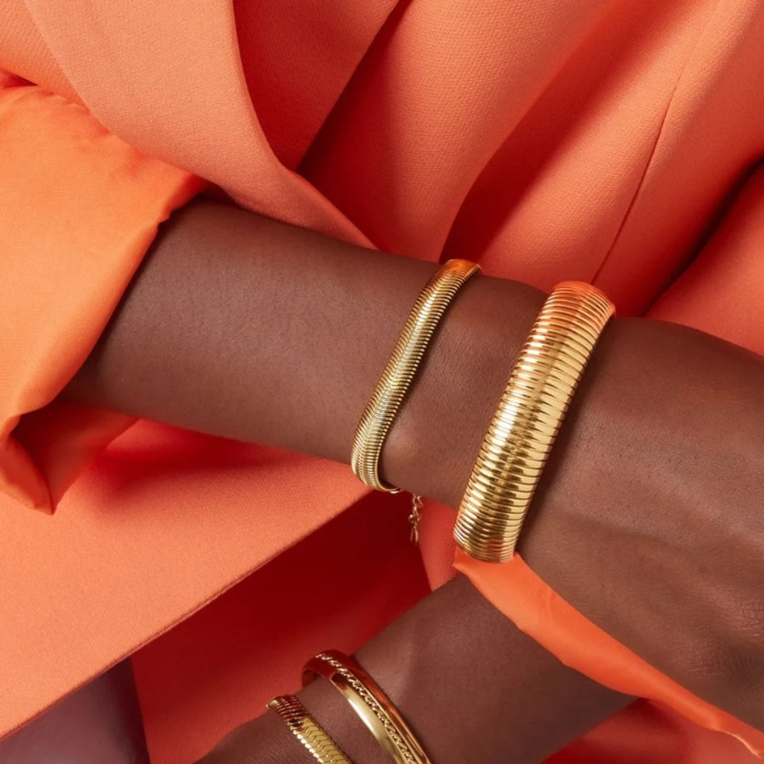 The bracelet is a refined and stylish piece, crafted from 18k gold-plated sterling silver. The design stands out due to its flat, flexible structure with subtle, wave-like patterns, giving the bracelet a contemporary and chic appearance.