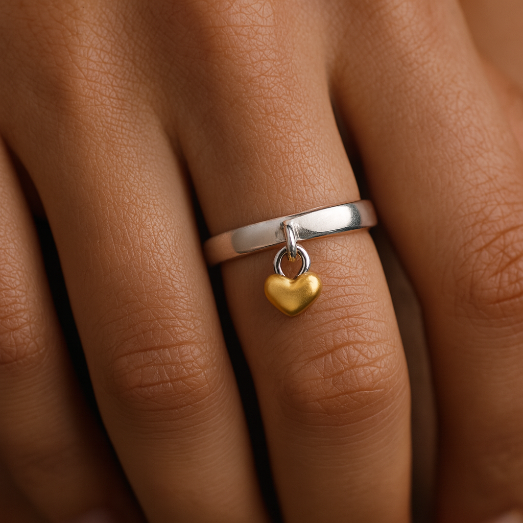 This two-tone ring features a polished silver band adorned with a small dangling heart charm in a soft gold-tone finish. The subtle contrast between the band and charm adds a balanced visual appeal. Suitable for casual or occasion wear, this accessory complements a variety of personal styles.